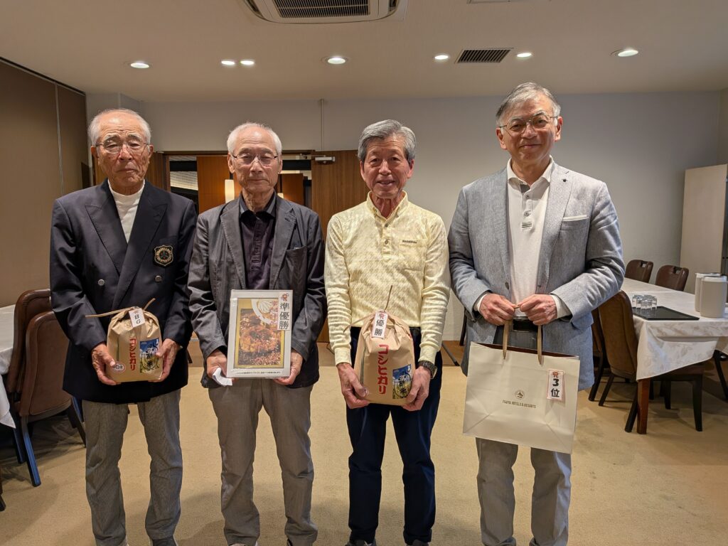 エイジシュート特別賞の授与後のご挨拶で、「私たちは年齢を重ねるごとに筋力が落ち、飛距離が落ちる事は仕方がない、それをカバーするために私は練習の8割を50ヤード以内の寄せとパッティングをしております。それが今日の好スコアにつながりました。」とのお話を聞き、 一同納得して「よし、明日から俺もそれをやるよ」などの会話が飛び交い、皆さん笑顔満面の中で 次回再会を約束して閉会しました。